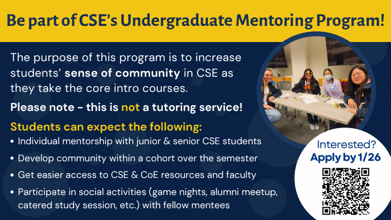 “I am running a peer mentorship program that matches students in the core intro CS courses (183, 203, 280, 281) with more senior students who have already been through those courses. The focus is on community building and supporting students as they begin their journey through CSE.”