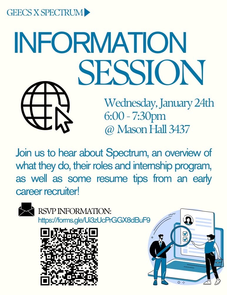 GEECS x Spectrum - Wednesday 1-24, 6-7:30 pm, 3437 Mason Hall. RSVP here if you haven’t already! Spectrum will give us an overview of different internship/full-time opportunities, what their company has to offer, and what the application process looks like! Cottage-In Pizza will be provided for dinner.